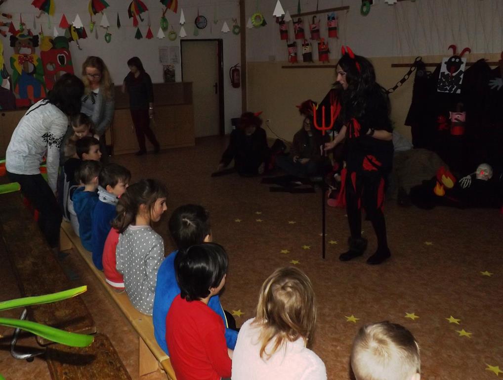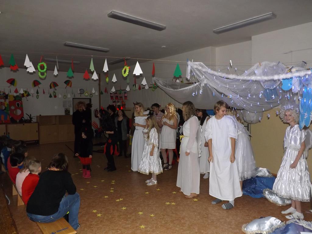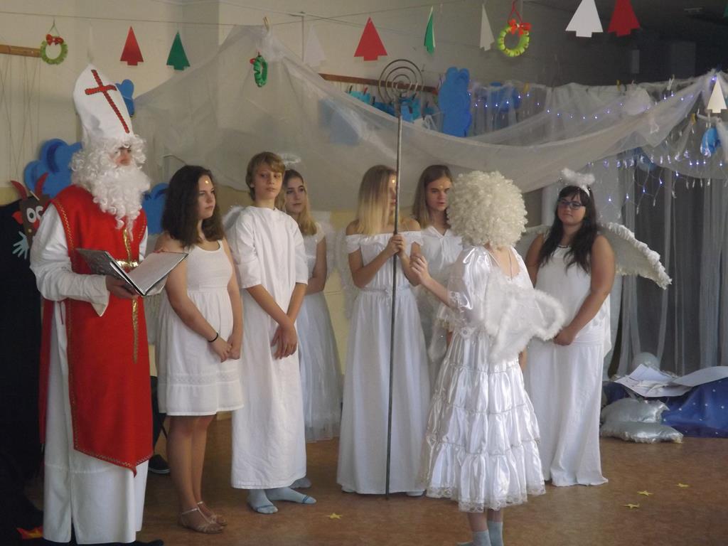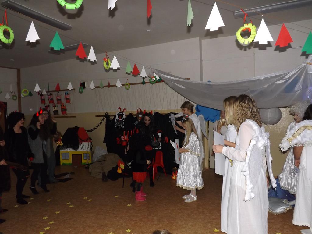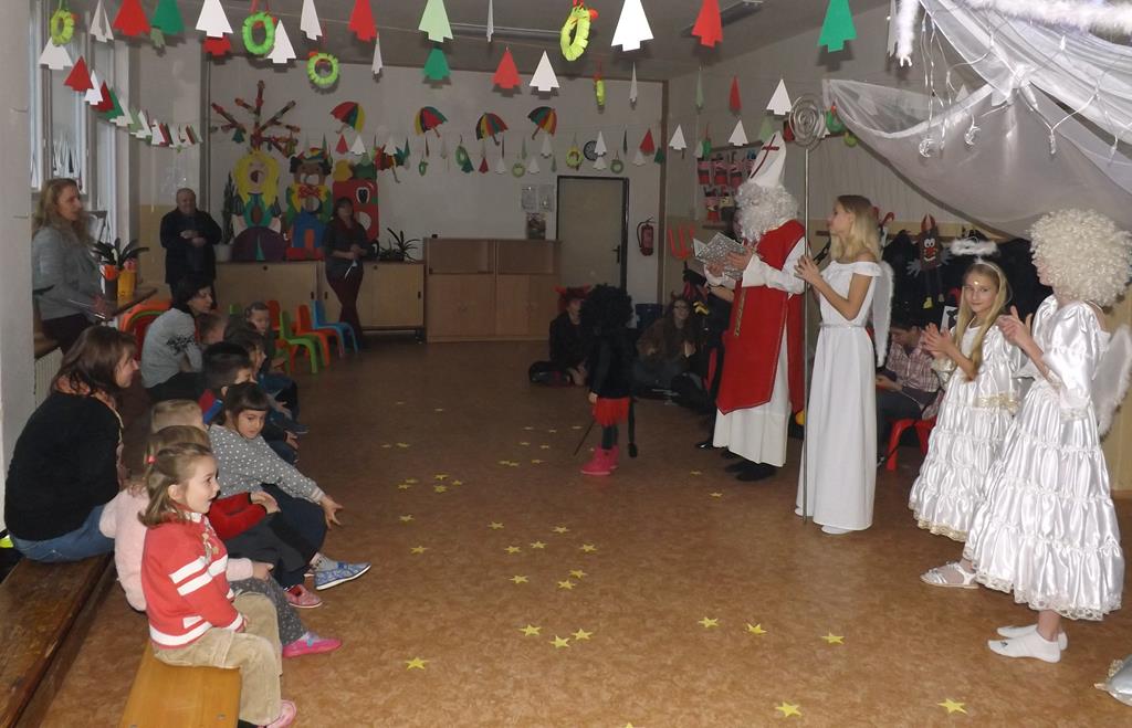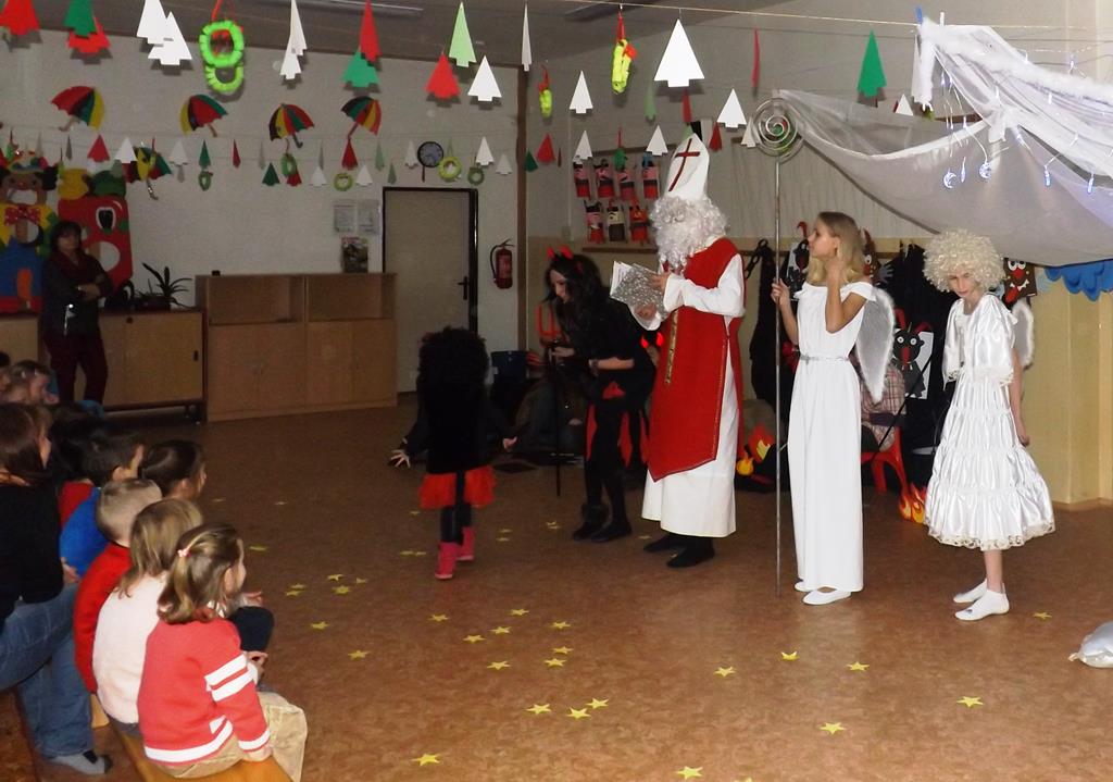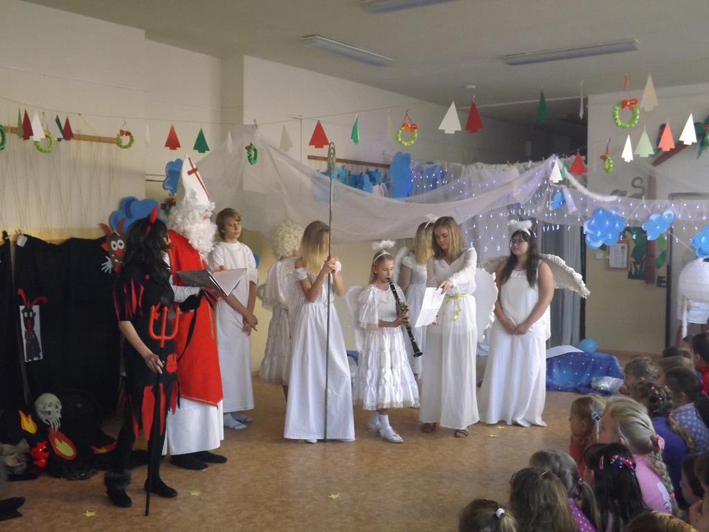 Začátek prosince se nese ve znamení svatého Mikuláše. Ten společně se svou družinou navštěvuje domácnosti a obdarovává děti, ale také je kárá. Mikulášova družina navštívila i první stupeň a družinu naší školy. Chodbami se rozléhalo zvonění zvonků, bouchání na dveře a čertí blekotání. Jedna Mikulášova družina, byli to žáci IX. A pod vedením paní učitelky Heleny Daňkové, si pro naše děti z prvních tříd a děti z MŠ Komenského a MŠ Smetanova připravila velmi pěknou a vtipnou pohádku, která se odehrávala v pekle i v nebi. Další družina žáků z IX. C společně s panem učitelem Davidem Pavelkou obcházela vyšší ročníky prvního stupně. Jak poznamenaly některé děti: „Škoda, že Mikuláš nechodí častěji.“