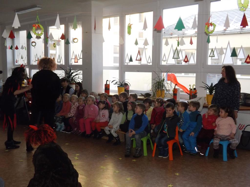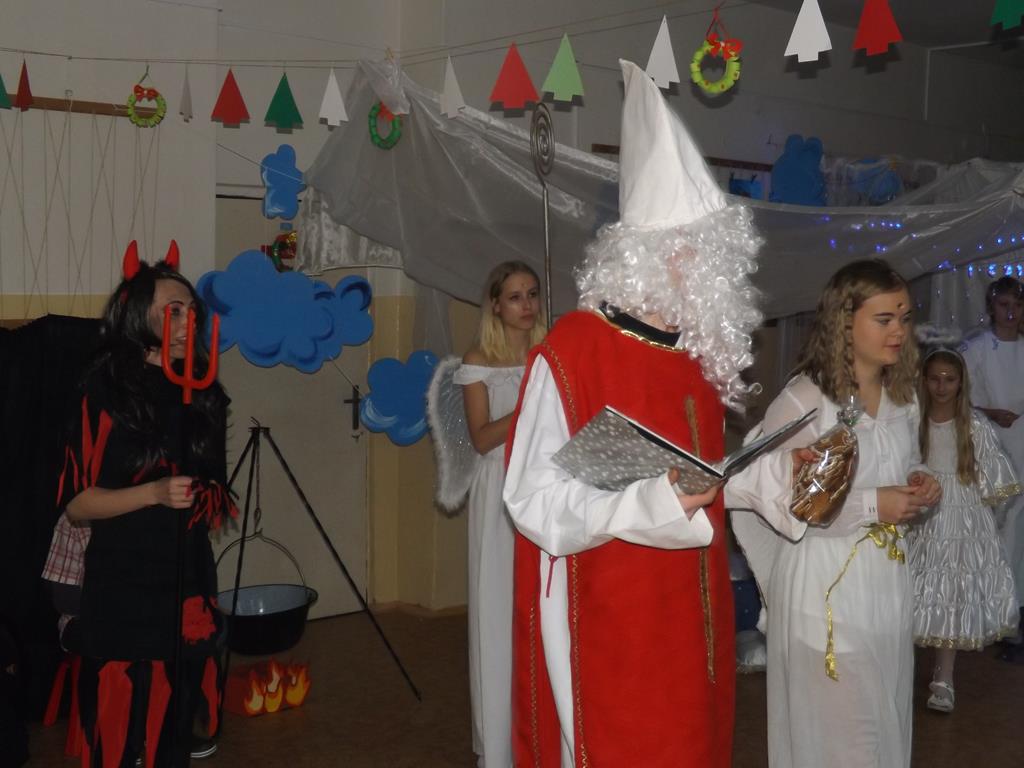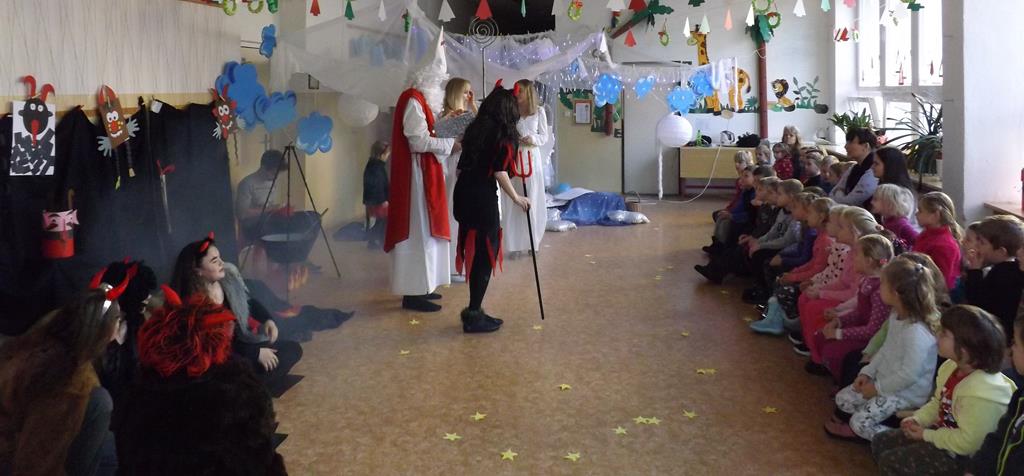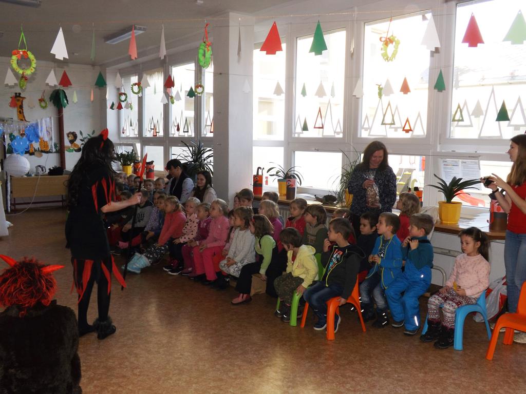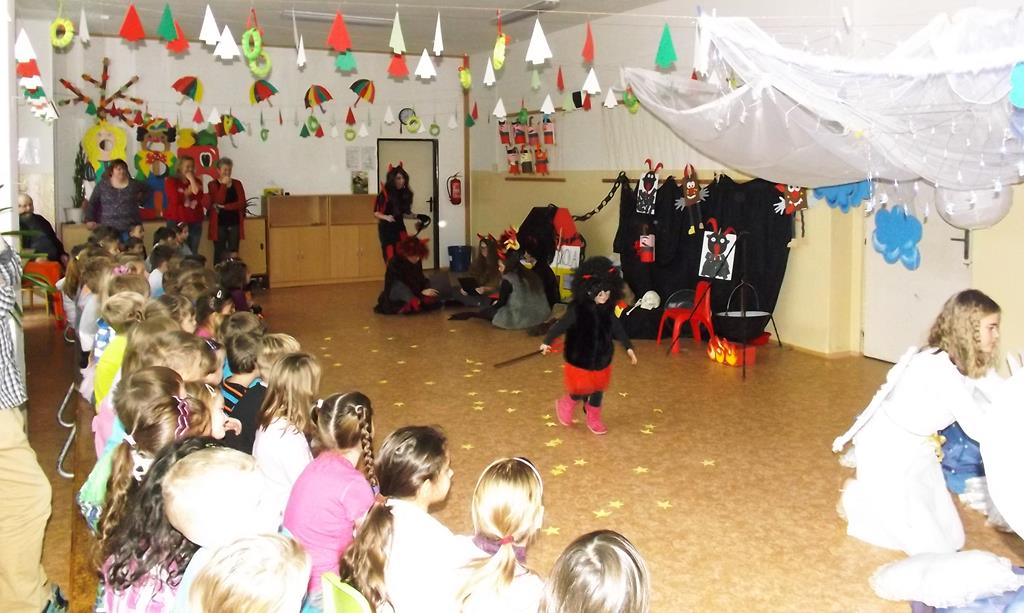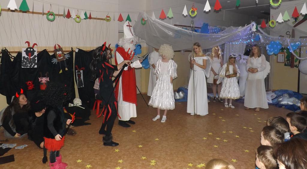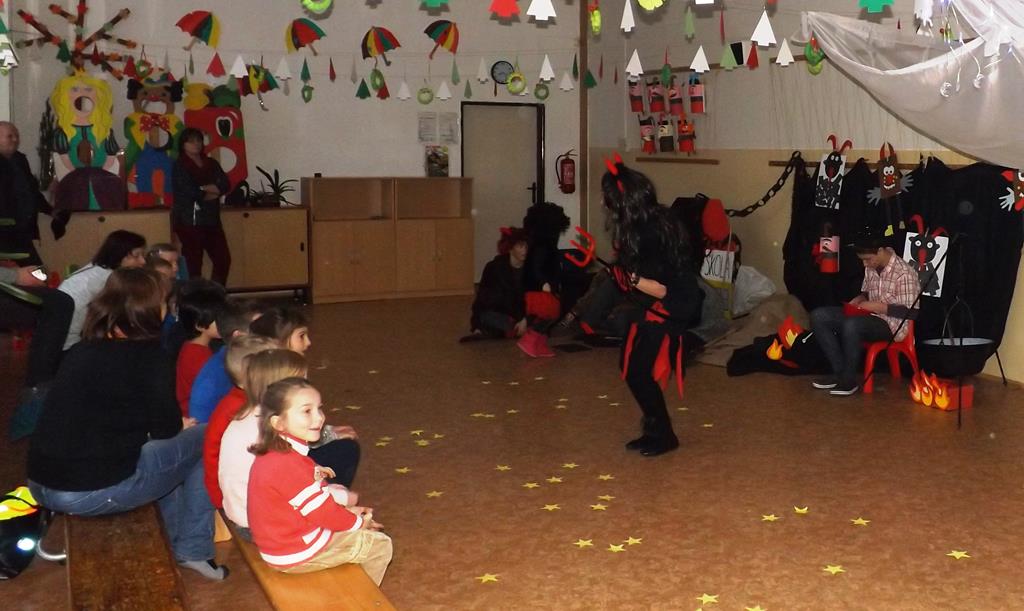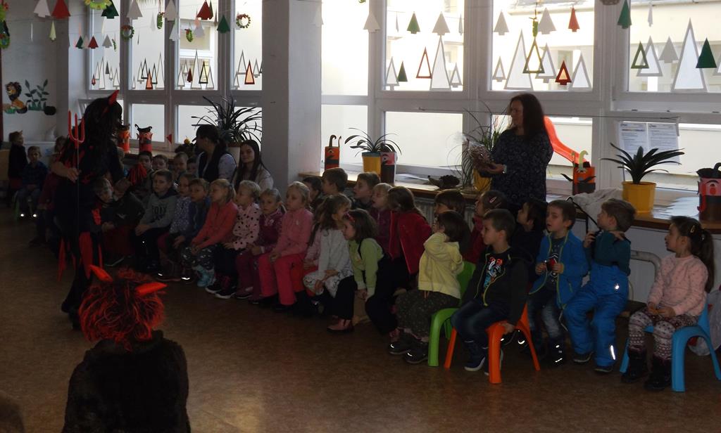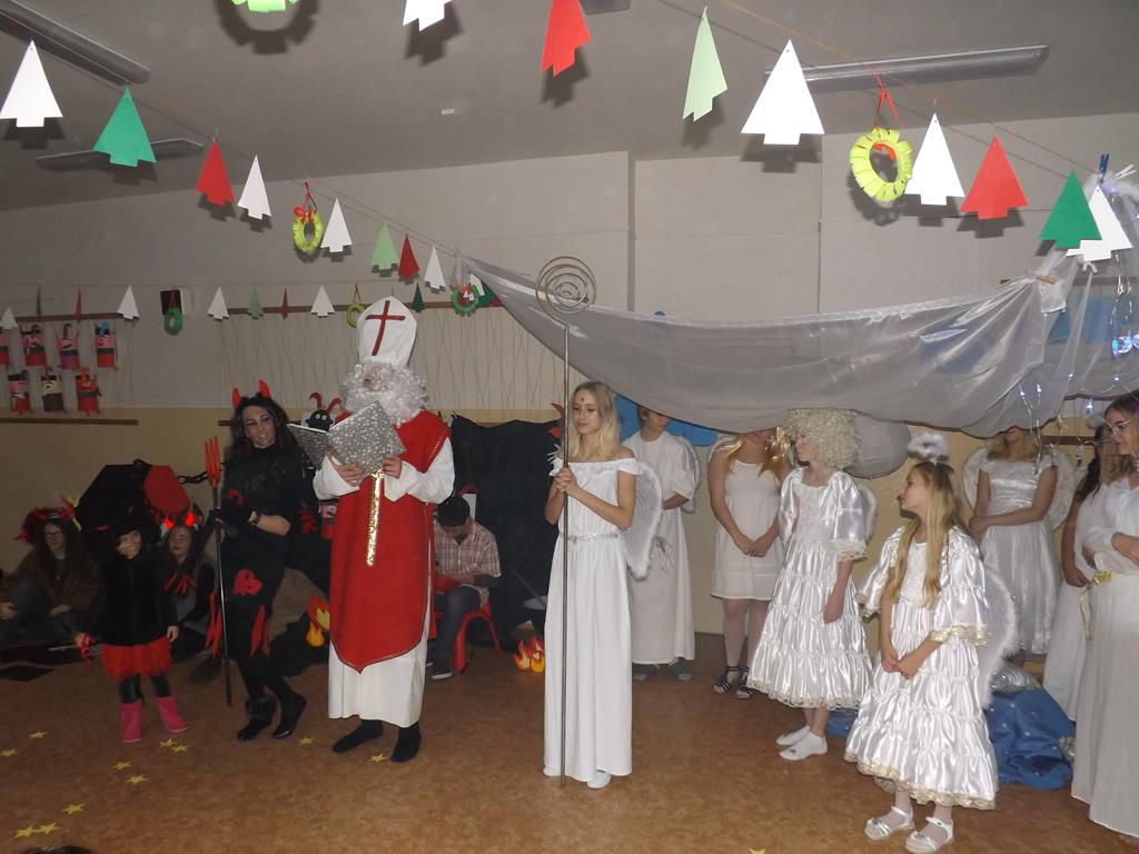 Začátek prosince se nese ve znamení svatého Mikuláše. Ten společně se svou družinou navštěvuje domácnosti a obdarovává děti, ale také je kárá. Mikulášova družina navštívila i první stupeň a družinu naší školy. Chodbami se rozléhalo zvonění zvonků, bouchání na dveře a čertí blekotání. Jedna Mikulášova družina, byli to žáci IX. A pod vedením paní učitelky Heleny Daňkové, si pro naše děti z prvních tříd a děti z MŠ Komenského a MŠ Smetanova připravila velmi pěknou a vtipnou pohádku, která se odehrávala v pekle i v nebi. Další družina žáků z IX. C společně s panem učitelem Davidem Pavelkou obcházela vyšší ročníky prvního stupně. Jak poznamenaly některé děti: „Škoda, že Mikuláš nechodí častěji.“