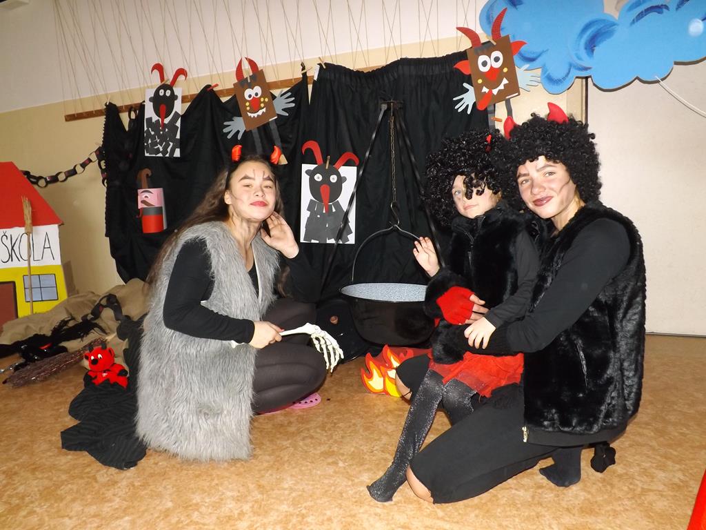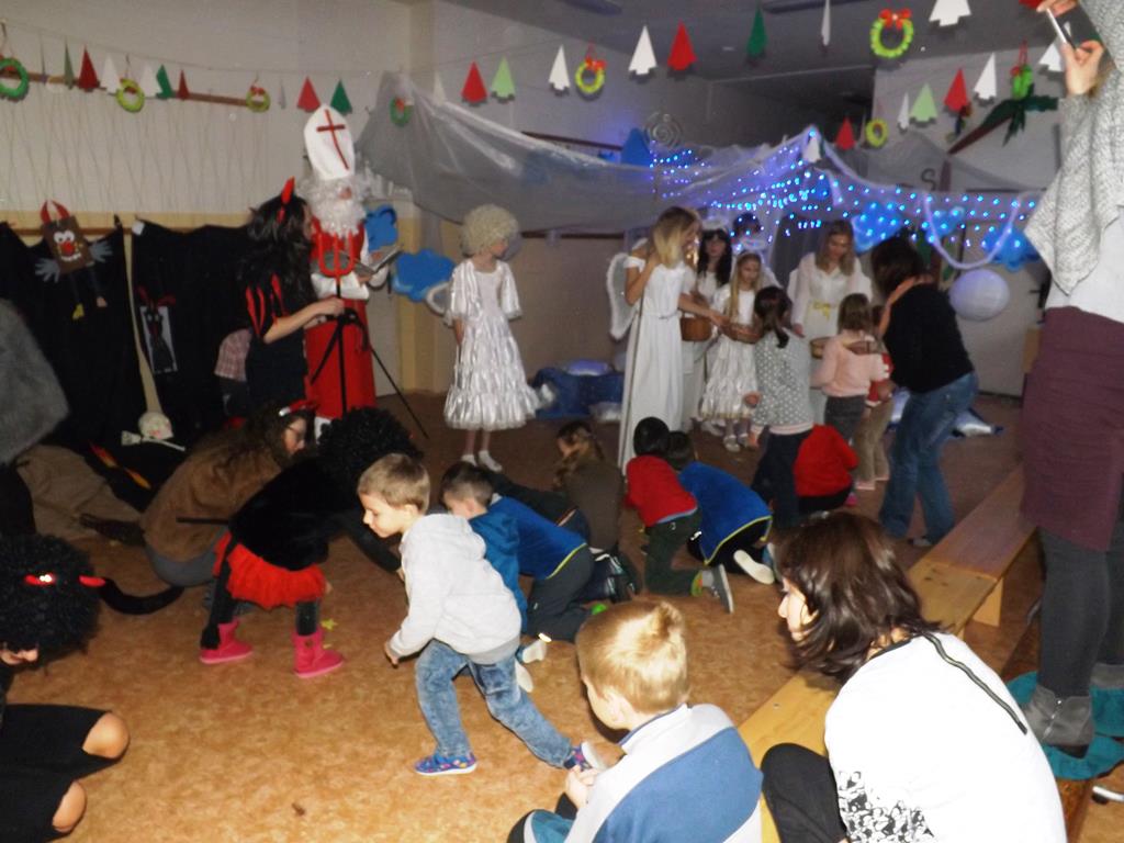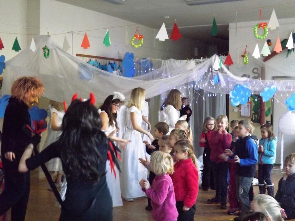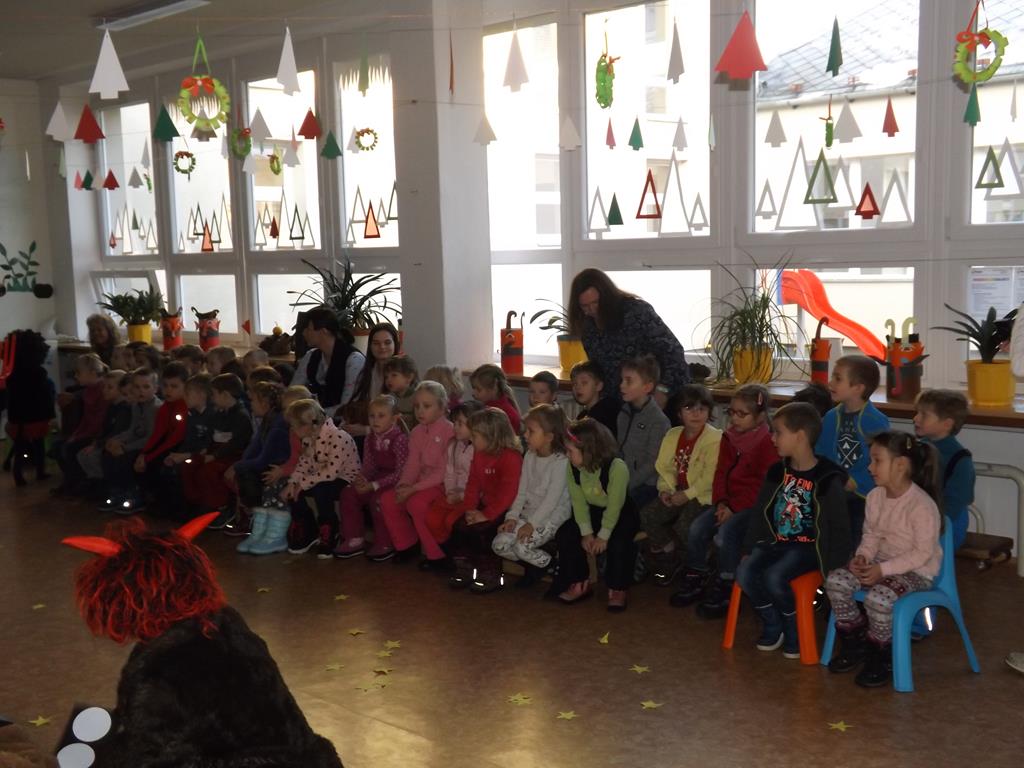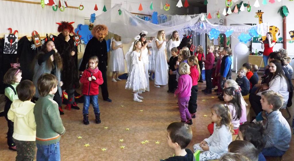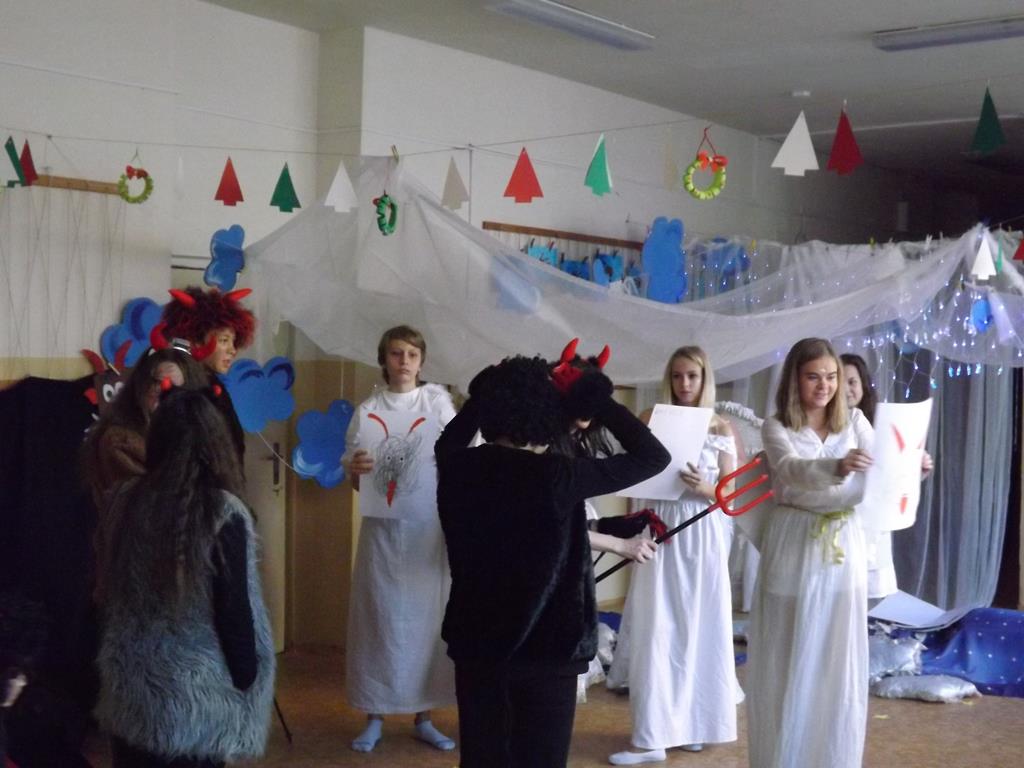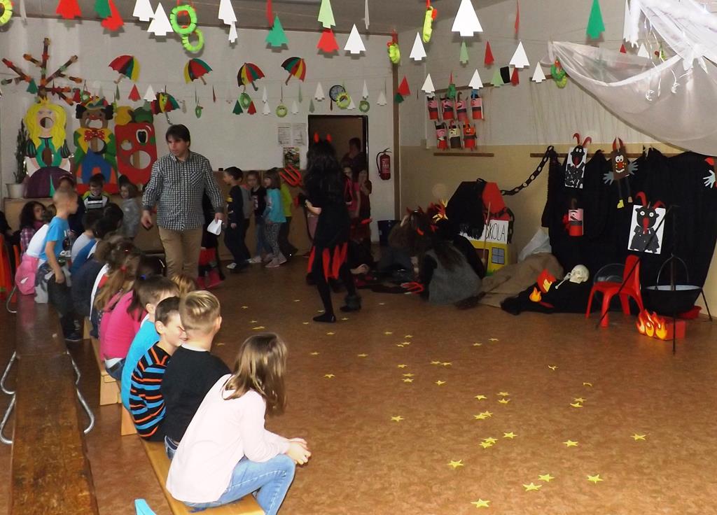 Začátek prosince se nese ve znamení svatého Mikuláše. Ten společně se svou družinou navštěvuje domácnosti a obdarovává děti, ale také je kárá. Mikulášova družina navštívila i první stupeň a družinu naší školy. Chodbami se rozléhalo zvonění zvonků, bouchání na dveře a čertí blekotání. Jedna Mikulášova družina, byli to žáci IX. A pod vedením paní učitelky Heleny Daňkové, si pro naše děti z prvních tříd a děti z MŠ Komenského a MŠ Smetanova připravila velmi pěknou a vtipnou pohádku, která se odehrávala v pekle i v nebi. Další družina žáků z IX. C společně s panem učitelem Davidem Pavelkou obcházela vyšší ročníky prvního stupně. Jak poznamenaly některé děti: „Škoda, že Mikuláš nechodí častěji.“