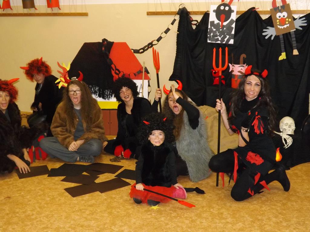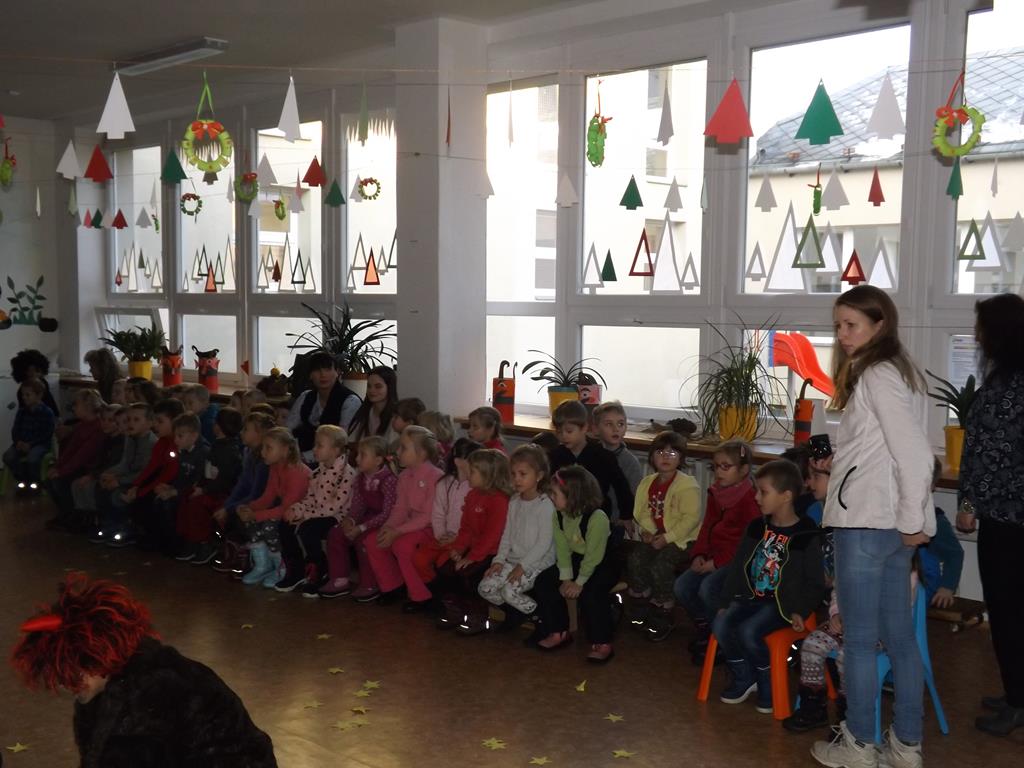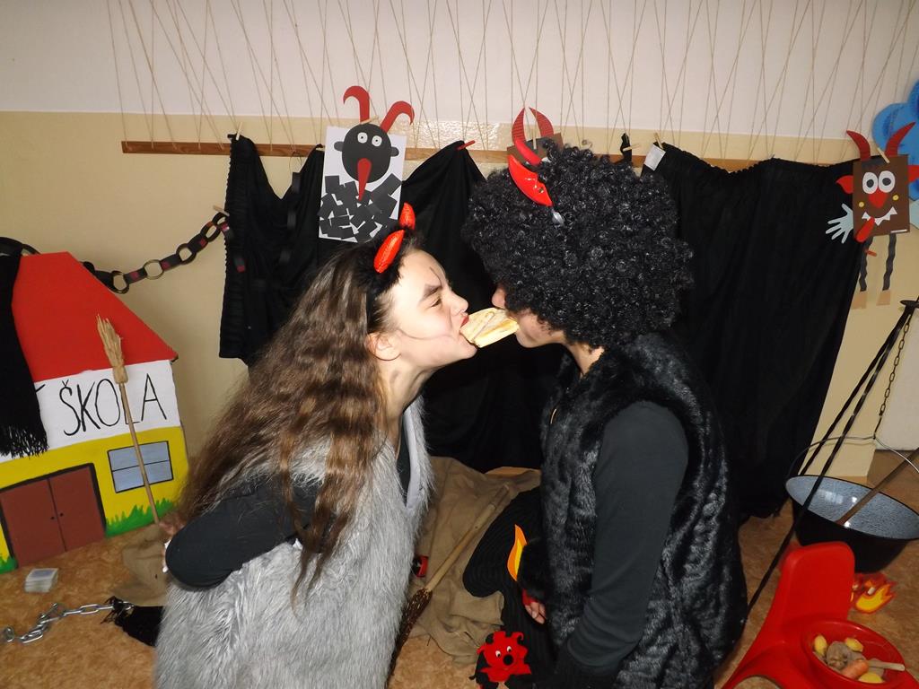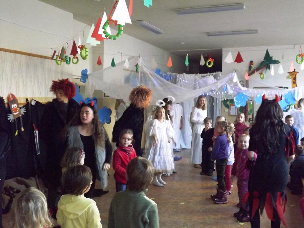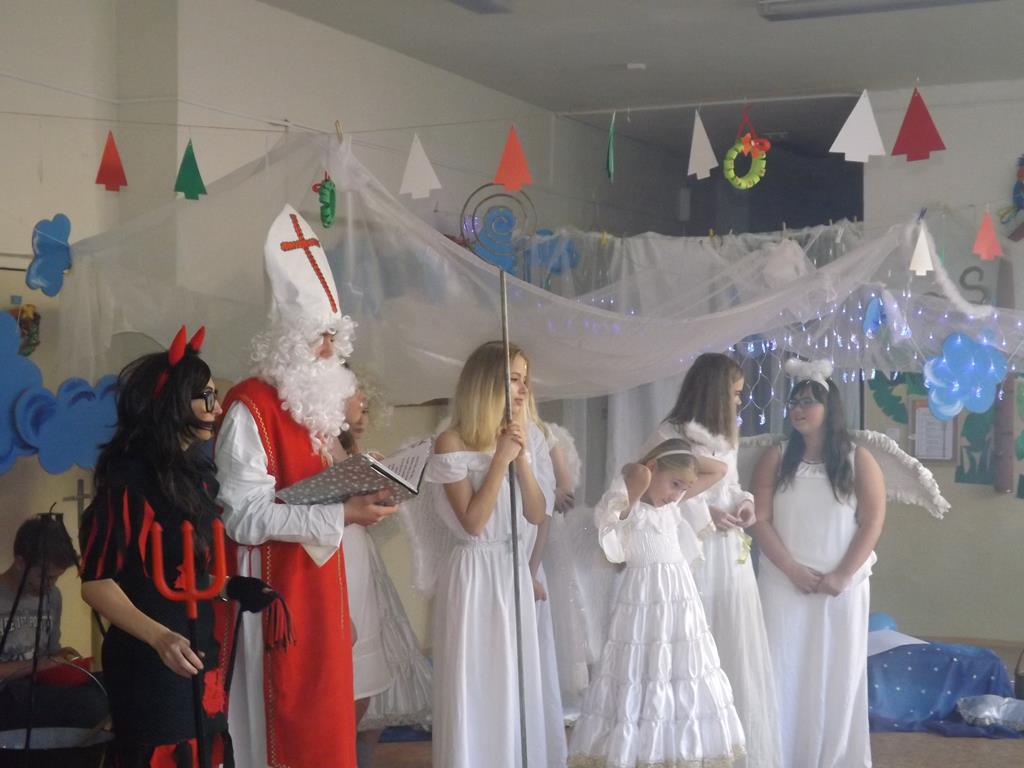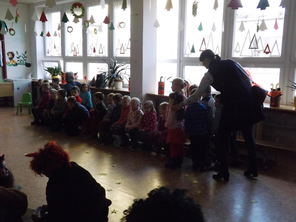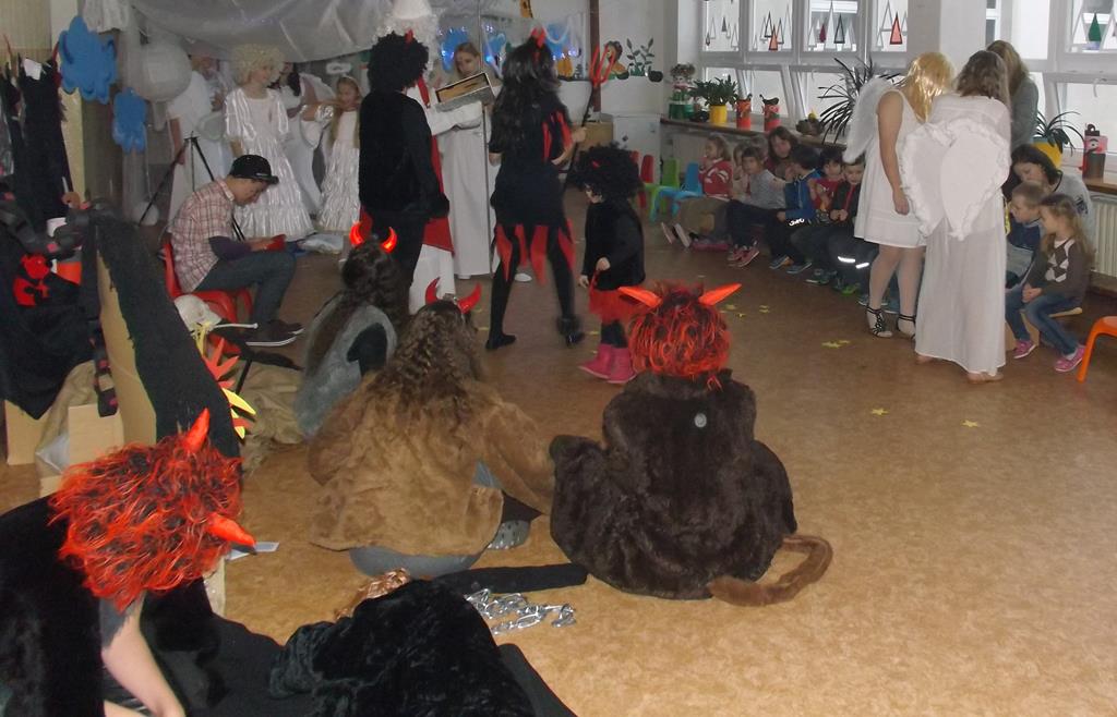 Začátek prosince se nese ve znamení svatého Mikuláše. Ten společně se svou družinou navštěvuje domácnosti a obdarovává děti, ale také je kárá. Mikulášova družina navštívila i první stupeň a družinu naší školy. Chodbami se rozléhalo zvonění zvonků, bouchání na dveře a čertí blekotání. Jedna Mikulášova družina, byli to žáci IX. A pod vedením paní učitelky Heleny Daňkové, si pro naše děti z prvních tříd a děti z MŠ Komenského a MŠ Smetanova připravila velmi pěknou a vtipnou pohádku, která se odehrávala v pekle i v nebi. Další družina žáků z IX. C společně s panem učitelem Davidem Pavelkou obcházela vyšší ročníky prvního stupně. Jak poznamenaly některé děti: „Škoda, že Mikuláš nechodí častěji.“