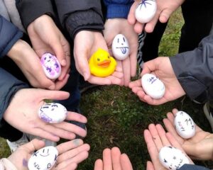 Ve středu si žáci 7. A užili anglickou velikonoční tradici – závod kačenek. Někteří sice nahradili kačenky vajíčky, ale i tak bylo o zábavu postaráno.